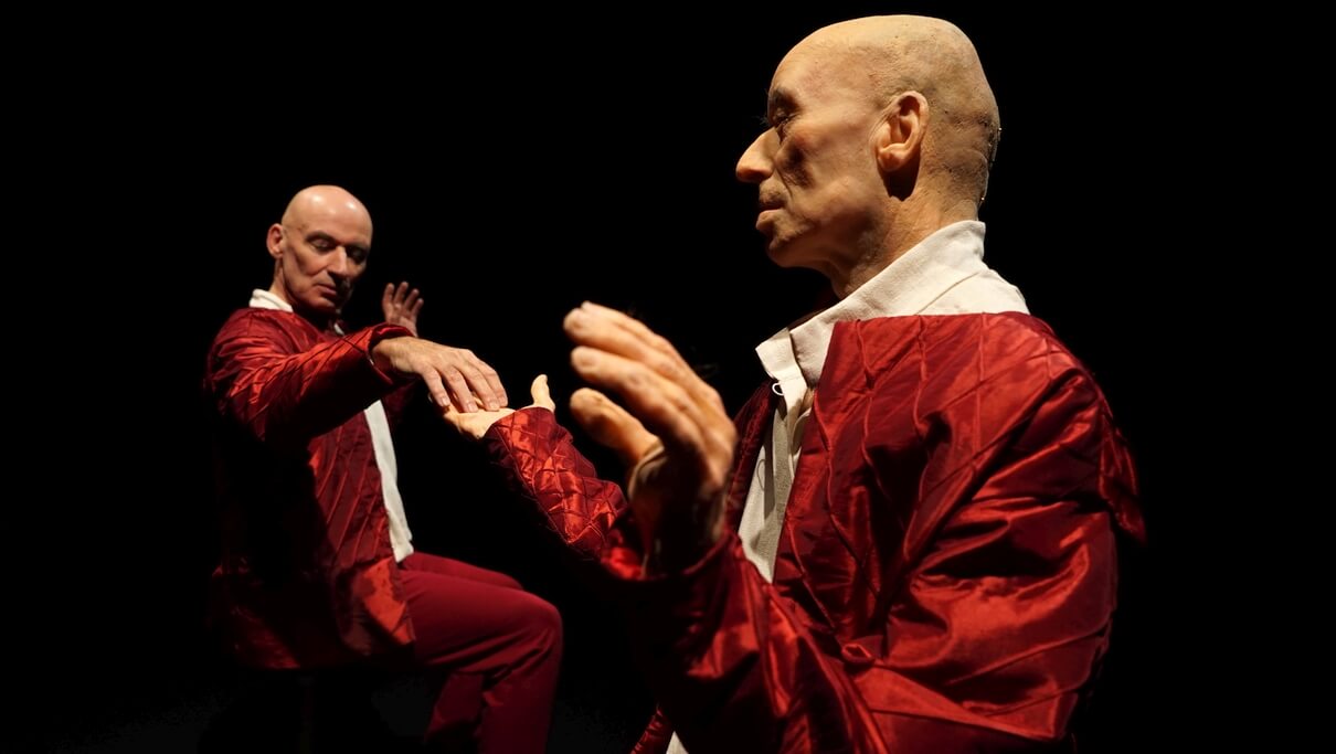 4. November 2023, 20 Uhr. Die Bühne des Figurentheaterzentrums in Stuttgart wird durch einen dunklen Schirm aus semitransparentem Stoff in zwei Teile geteilt. Schemenhaft erkennen wir beim Hereinkommen eine Person in rotem Anzug und weißem Hemd, die ebenso stumm wie starr vor dem Schirm auf einem Hocker sitzt. Das Gesicht können wir nicht erkennen. Ich weiß ja aus Gesprächen mit Iris Meinhardt und Michael Krauss, dem Figurentheaterduo, das diesen Abend kreiert hat, dass sich auf der Bühne ein lebensgroßer Androide aus softwaregesteuerten Servomotoren, vielen mechanischen Teilen, bespannt mit einer dem Tänzer Ludger Lamers abgegossenen Silikonhaut, befinden muss. Das ist er. Oder? Oder nicht? Doch nicht?