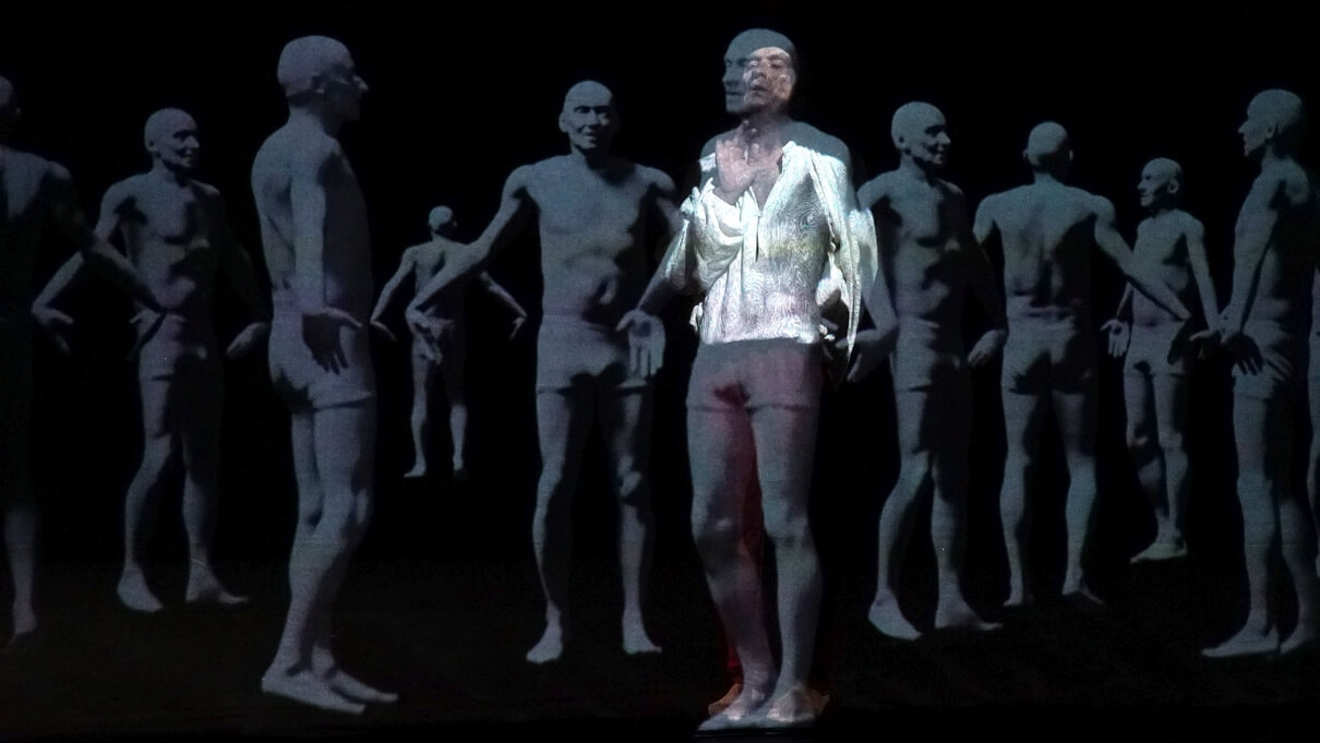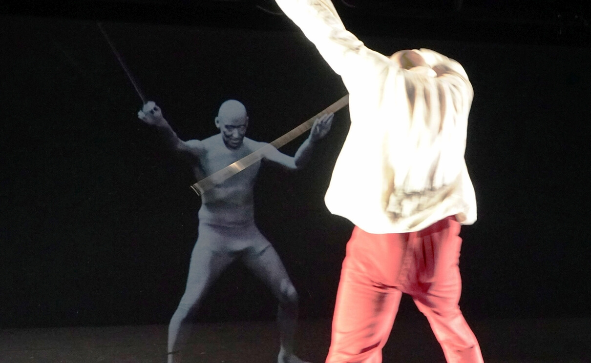 Es geht weiter. Lamers ficht mit seinem computergraphischen Double ein vor allem in seiner perspektivischen Perfektion beeindruckendes Duell. „Das ist besonders schwierig“, sagt Krauss. „Der Tänzer sieht das projizierte Modell ja aus derselben Perspektive wie der Zuschauer. Er kann nicht auf das Modell direkt reagieren, sondern muss unabhängig von ihm eine Choreographie tanzen und am besten das Bild gar nicht beachten. Er muss darauf vertrauen, dass sich beide Bewegungen in den Köpfen der Zuschauerinnen und Zuschauer zu einer stimmigen Szene zusammenfügen.“