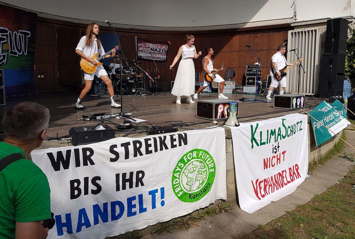 Mit ein absolutes Highlight bei der Abschlusskundgebung im Stadtgarten war der leider viel zu kurze Auftritt der deutschsprachigen Punk-/Hard-Rock-Band „Sündflut“ aus dem Schwäbischen. Deutliche Kritik an der vernachlässigten Klimapolitik, klare Kante gegen die rechten Ungeister: „Die Hütte brennt, wir müssen noch viel lauter sein“. Bleibt zu hoffen, dass man diese wunderbare Truppe bald ausgiebig auf einer Konstanzer Bühne erleben kann.