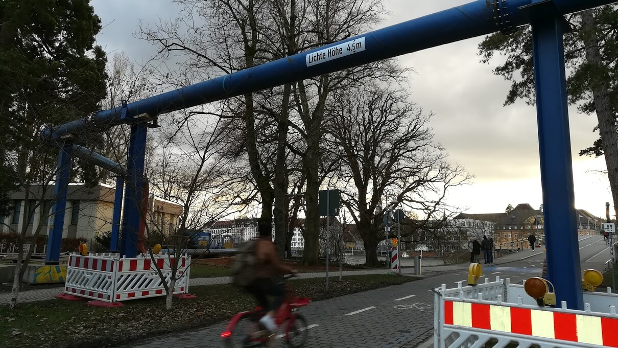Auf der Petershausener Seite gibt es dort eine deutliche Warnung: Dort steht gut lesbar mitten über dem Radweg „Lichte Höhe 4,5 m“. Das ist für große Menschen verdammt knapp, also ziehen Radelnde (wie auf dem Foto zu sehen) rechtzeitig den Kopf ein.
