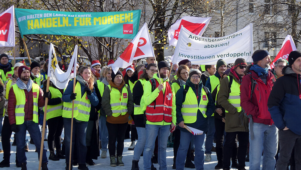 Die Lohnabhängigen haben mittlerweile die Nase voll. Noch immer weigern sich die Finanzminister:innen der Länder, den Beschäftigten des öffentlichen Diensts überhaupt ein Angebot zu machen. Dabei fordern ver.di und Beamtenbund lediglich 10,5 Prozent mehr Lohn – mindestens jedoch 500 Euro mehr im Monat. Noch langwieriger verlaufen die Tarifverhandlungen im Einzelhandel (ver.di-Forderung: 15 Prozent): Sie ziehen sich seit einem halben Jahr hin. Und so waren vor dem Treffpunkt Petershausen auch Delegierte der örtlichen Filialen von Zara, Esprit und Kaufland präsent, um ihre Solidarität mit den streikenden Kolleg:innen zu zeigen.