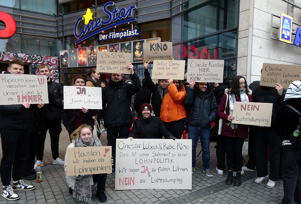 Die Stimmung war beeindruckend gut an jenem ersten Samstag im Dezember 2022. Kaum hatte das Großkino im Lago-Center die Pforten geöffnet, standen über drei Dutzend Cinestar-Beschäftigte vor dem Bau und schwenkten ihre Plakate. „Hier wird Wertschätzung klein geschrieben“, stand auf einem der handgemalten Kartons, „Popcorn kann versalzen sein, unser Lohn ist es immer“, auf einem anderen. Oder: „Cinestar – ein unsozialer Star am Himmel“.
