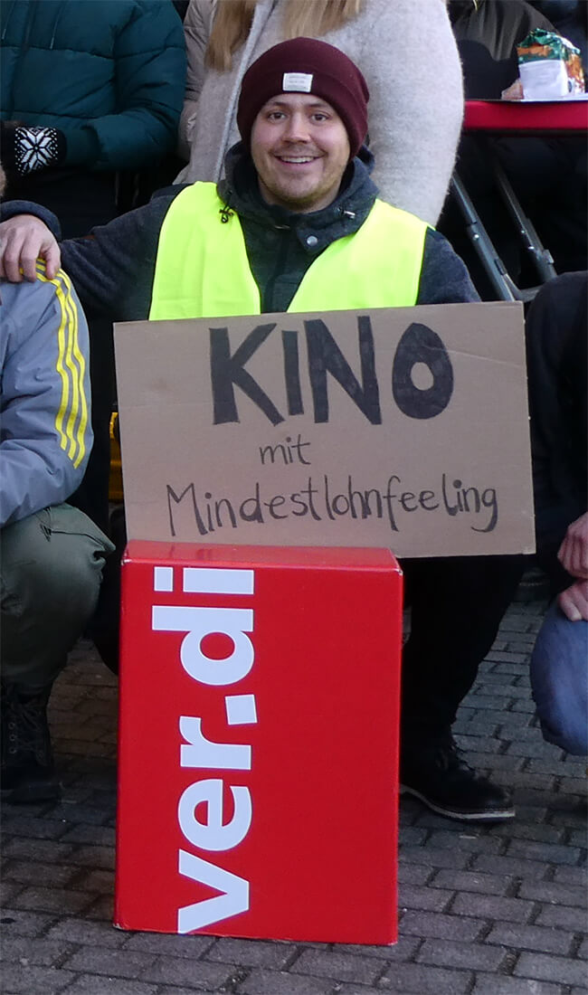 Inzwischen stehen die nächsten Tarifverhandlungen im Cinestar-Verbund an – und es sieht ganz danach aus, als würden die Konstanzer ver.di- Mitglieder bei Cinestar nicht wieder für einen eigenen Haustarifvertrag kämpfen können. Umso wichtiger ist eine spürbare Anhebung des normalen Entgelts, und das nicht nur in den unteren Lohngruppen. Wer beispielsweise zwanzig Jahre dabei ist, bekommt zwar ein bisschen mehr als die 12,05 Euro, aber eben nur 13,25 Euro. „Bei diesem Niveau kannst du ausrechnen, wie viel Rente du einmal kriegst“, sagt Marcel Uhrig.